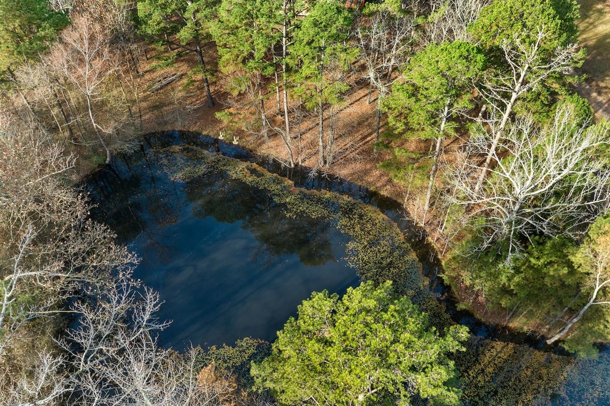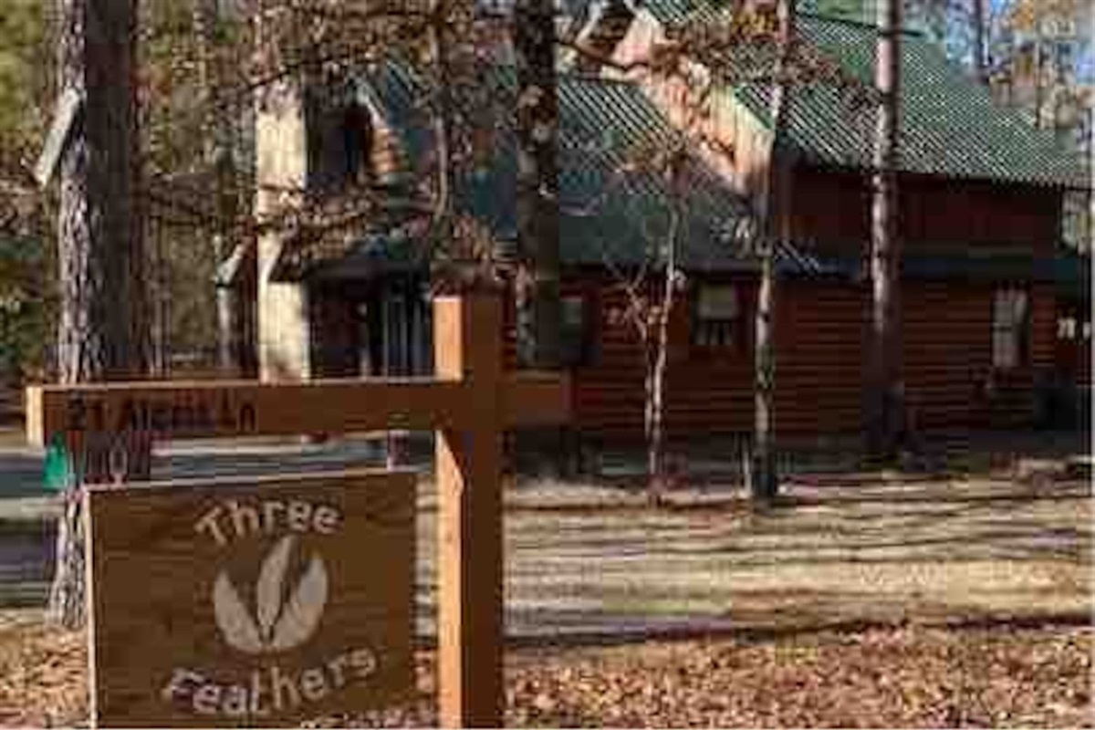 Come escape to a beautiful cabin oasis on the pond! This charming cabin in the woods has lots to offer as a family vacation retreat. Three Feathers is a cozy 1.5 story log sided cabin with 2 spacious bedrooms and a full bath downstairs and, upstairs, a large open loft that has a pine wood wall separating sleeping quarters with 2 queen beds giving it the feeling of 2 extra bedrooms. The loft also offers a gaming table and a full bath for convenience to your upstairs quests. The open floor plan offers a cozy fireplace, warm pine walls, spacious kitchen and separate dining/seating areas. The outdoors has plenty of areas to play and adventure with a spring fed pond right out your backdoor. Imagine relaxing on the deck with a warm cup of coffee in the mornings while being serenaded by many species of birds. The wooded decks wrap around and lead to a private covered hot tub house. Just off from the hot tub house is a cozy fire pit where you can relax, roast marshmallows and get lost under the starts. The cabin is nestled in a private area and sits on an acre of land. Surround by tall native pines and post oaks, while enjoying your stay at Three Feathers you'll feel like you're miles from the city, tucked into a little slice of Heaven in the woods. By the way, be on the lookout for Woody, the red, black and white resident woodpecker. He's been known to make an appearance!